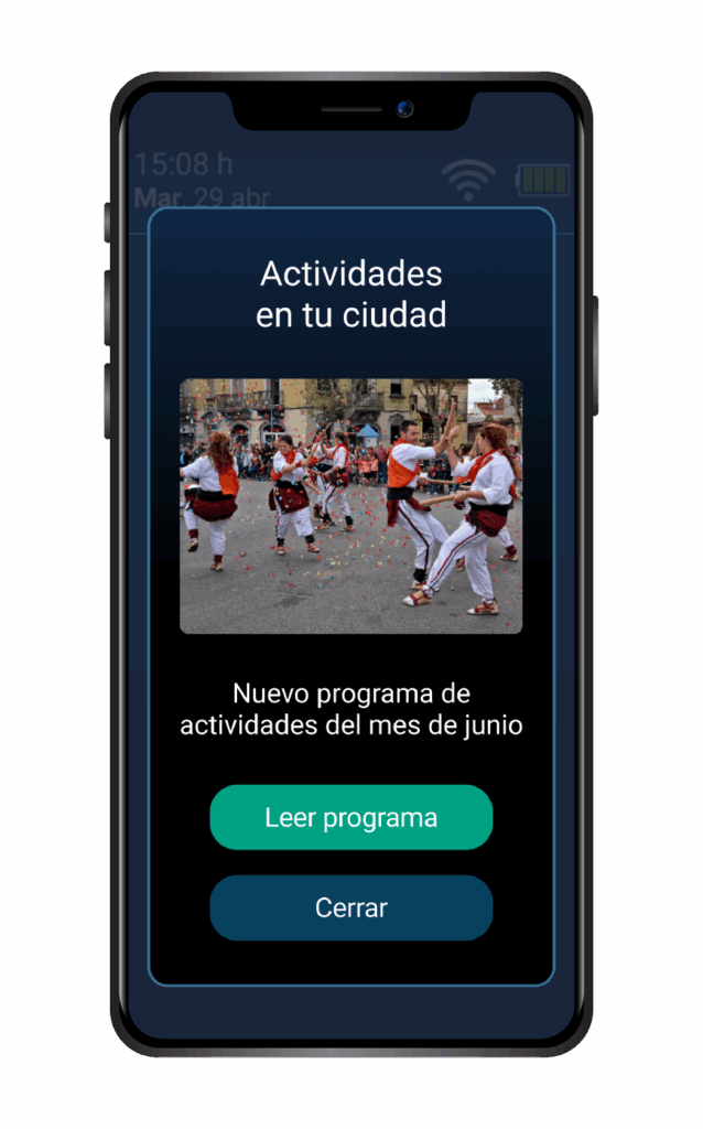 Conecta en Grande permite que mensajes como “alerta por fuertes lluvias” lleguen directamente a la pantalla principal de las personas mayores de tu municipio y incrementa su participación en las actividades.